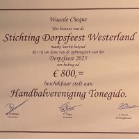 Wauw! Dankzij de inzet van onze vrijwilligers van Tonegido tijdens het Dorpsfeest Westerland hebben we een mooie € 800,- opgehaald! 🎉 Dit bedrag komt volledig ten goede aan de jeugdactiviteiten. Super bedankt allemaal!
